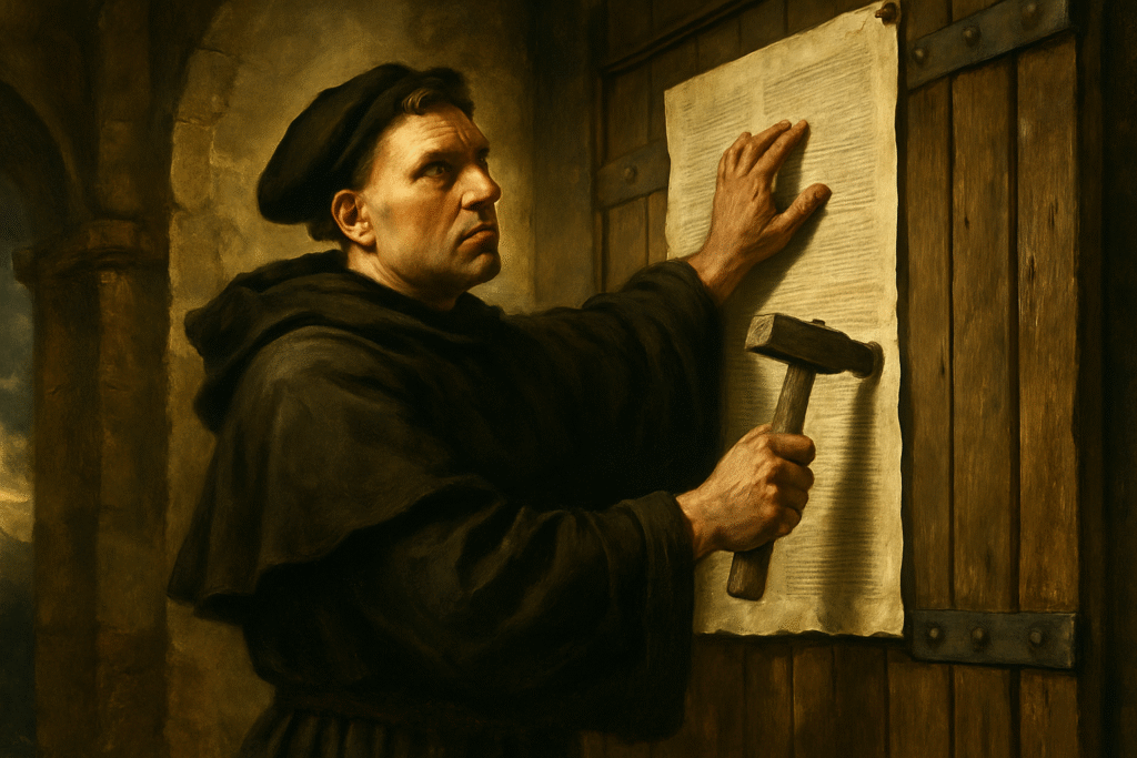 O ponto de ignição formal da Reforma ocorreu em 31 de outubro de 1517, quando o monge agostiniano e professor de teologia Martinho Lutero afixou suas 95 Teses na porta da Igreja do Castelo de Wittenberg, na Alemanha. Seu objetivo inicial era promover um debate acadêmico sobre a prática das indulgências. No entanto, suas críticas rapidamente evoluíram para um desafio direto à autoridade papal.